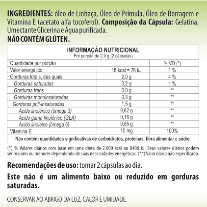 • Ingredientes principais: Óleo de Linhaça, Óleo de Prímula, Óleo de Borragem, Vitamina E