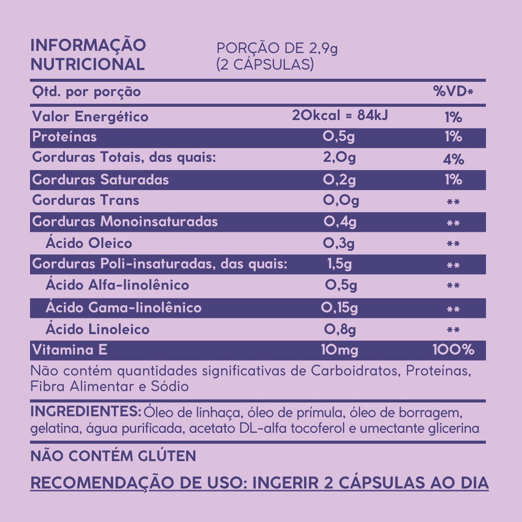 Sua fórmula combina três óleos naturais — Prímula, Linhaça e Borragem — aliados à Vitamina E, compondo um suplemento rico em ácidos graxos essenciais, como Ômega 3 e Ômega 6.