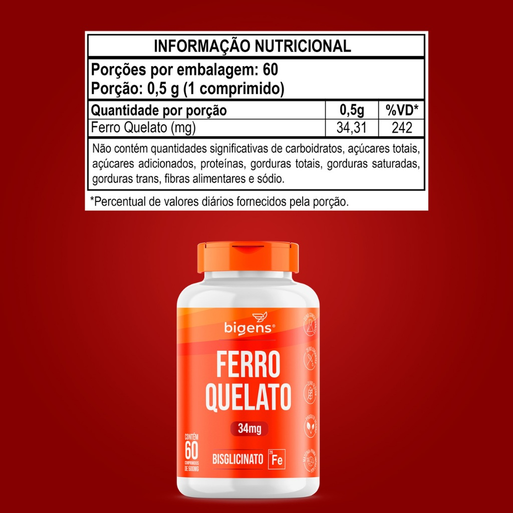 O Ferro Quelato Bigens é um suplemento de Ferro formulado para ter uma absorção mais eficaz no organismo. É um mineral orgânico composto por duas moléculas do aminoácido glicina ligadas ao íon ferroso (Fe2+), protegendo o mineral de reações indesejáveis e o tornando mais biodisponível, tendo, portanto, melhor absorção e eficácia, além de causar menor incidência de efeitos adversos em comparação aos sais de ferro, como o sulfato ferroso.